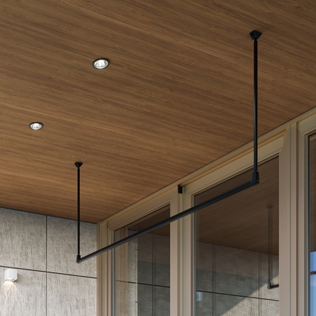 着脱できる軒天用物干。必要な時だけサッと取り出して使用することができます。室内干しや衣類乾燥機を日常的に使う方でも、乾きづらいものや室内に干しきれないものを屋外に干すことができます。