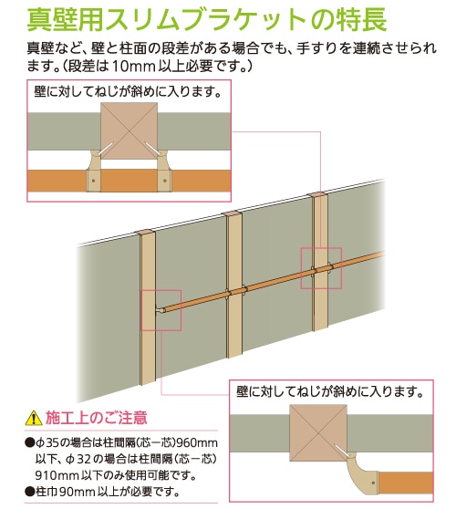真壁など、壁と柱面に段差がある場合でも、手すりを連続させられます。