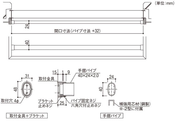 - 付属品:ブラケット止めネジ、六角レンチ、パイプ固定ネジ、補強用芯材(-2型のみ)