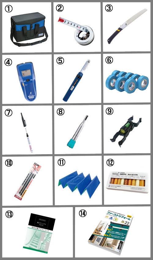 - のこぎりや下地探しなど、便利な工具をFRオリジナルツールバックにつめこみました。