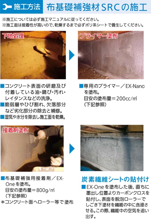 - 基礎を片面もしくは両面に貼り付け基礎の倒壊を防ぎます。
