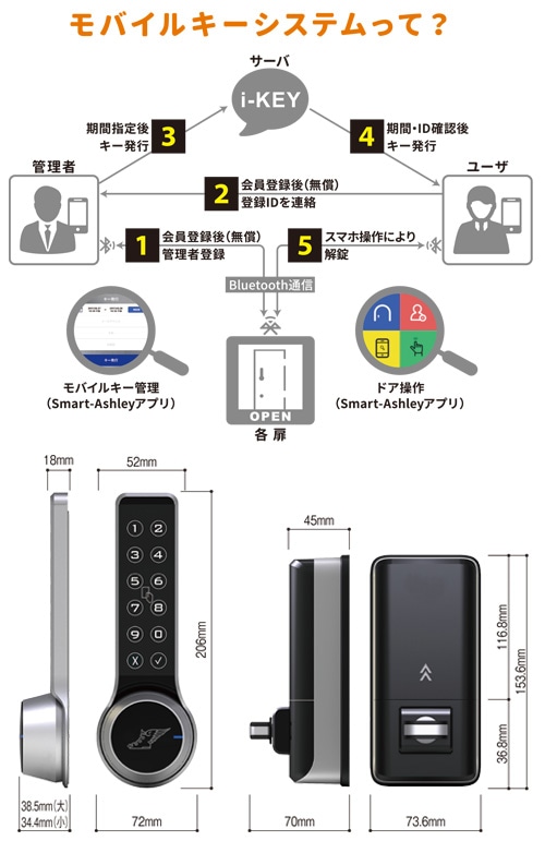- Felica、Mifareの他、暗証番号、オリジナルアプリ、指紋認証(Smart-Ashley+のみ)で施解錠