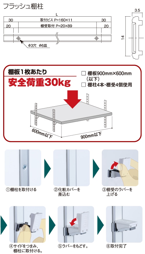 - 安全荷重30kg(棚板900mm×600mm以下、1枚あたり)※棚柱4本、棚受け4個使用