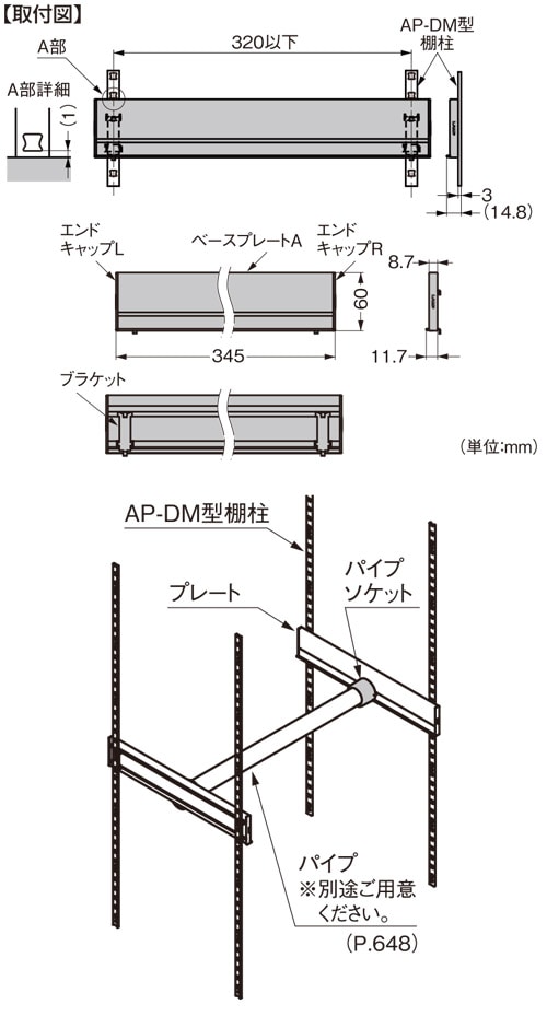 - 取付ける棚柱の間隔は320mm以下としてください。