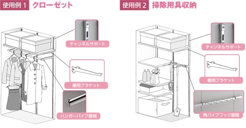 - パーツを組みあわせることでお好みにあった収納棚やハンガーパイプを取り付けることができます。