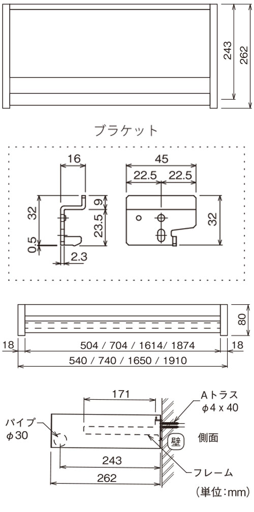 - 材質:フレーム、パイプ/アルミ押出材(アルマイト仕上、ラッピング)