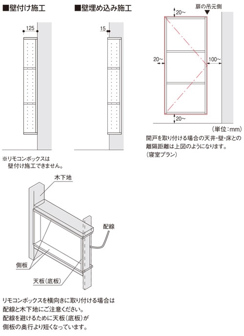 - 埋込み、壁付け、2パターンの設置方法で、限られた空間を有効活用できます。