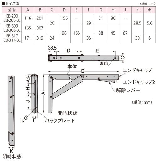 - 耐荷重:EB-200・200-BL/56kgf(本)、EB-303・303-BL/50kgf(本)、EB-317・317-BL/100kgf(本)
