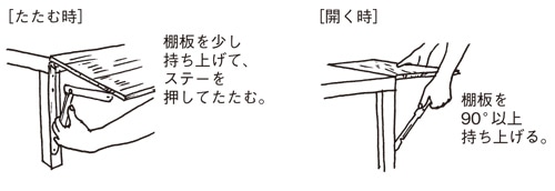 - たたむ時は棚板を少し持ち上げ、ステーを押してたたみます。