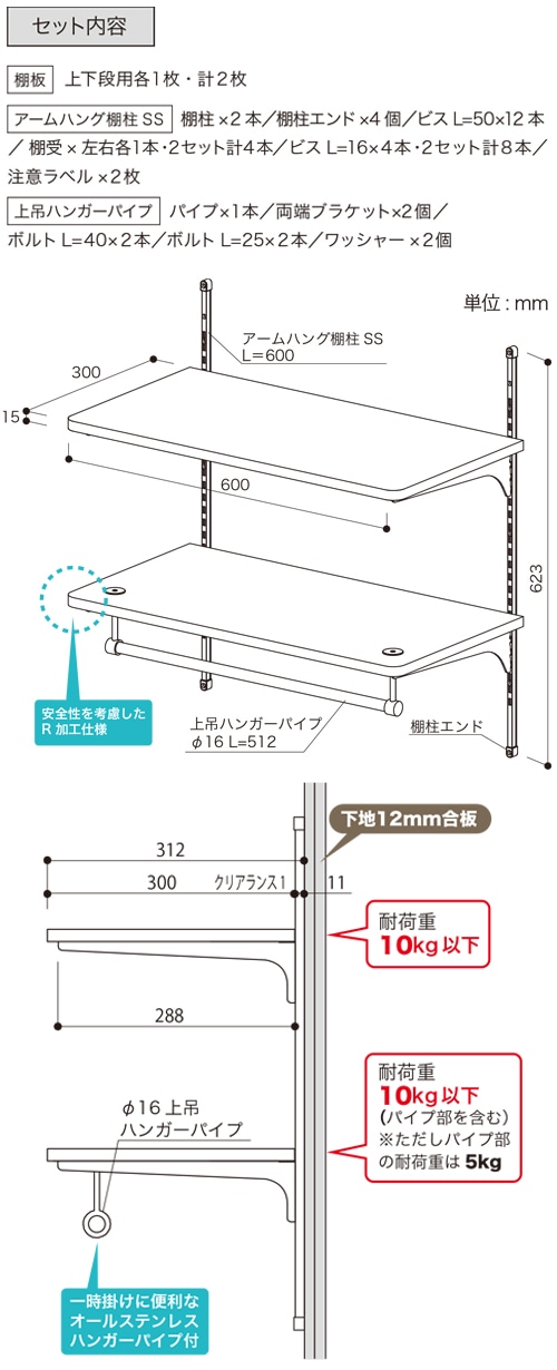 - 下段耐荷重:10㎏以下(パイプ部含む)※ただしパイプ部の耐荷重は5㎏