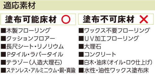 - 塗布可能床材:木製フローリング、コンポジションビニルタイル、リノリウム、クッションフロア