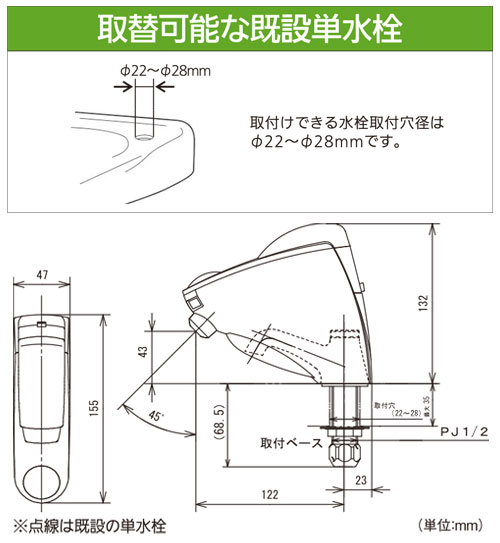 - 水すいSS1Vを取り付けるための単水栓用ベースがセットになった既設取替タイプです。