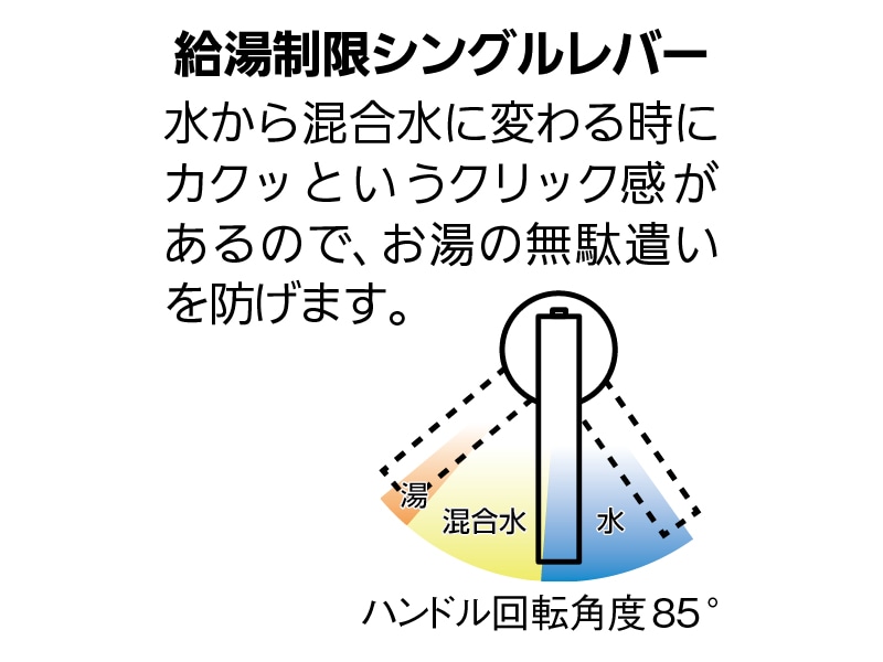 - 水から混合水に変わる時にカクッというクリック感があるので、お湯の無駄遣いを防げます。