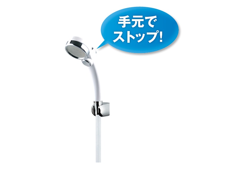 シャワーヘッドの手元ストップボタンで止水ができます。