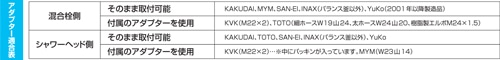 - 対応混合栓メーカー:TOTO、KAKUDAI、MYM、SAN-EI、KVK、INAX(バランス釜以外)、YuKo(2001年以降製造品)