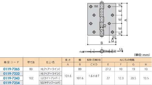 ステンレス平義星丁番 102ミリ ライトアンバー
