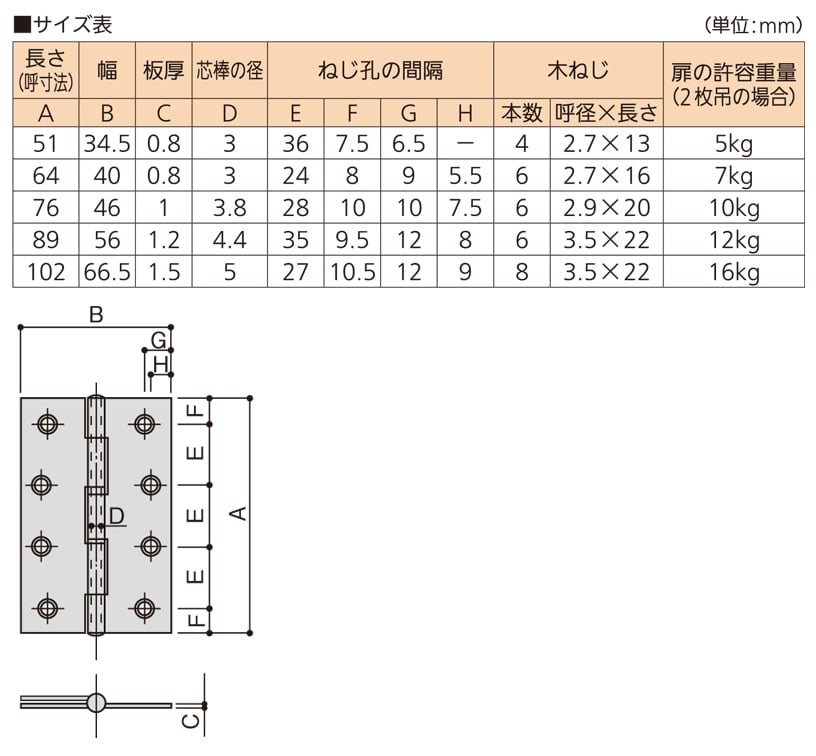 ステンレス中厚丁番ビス付 BK 51 光沢研磨