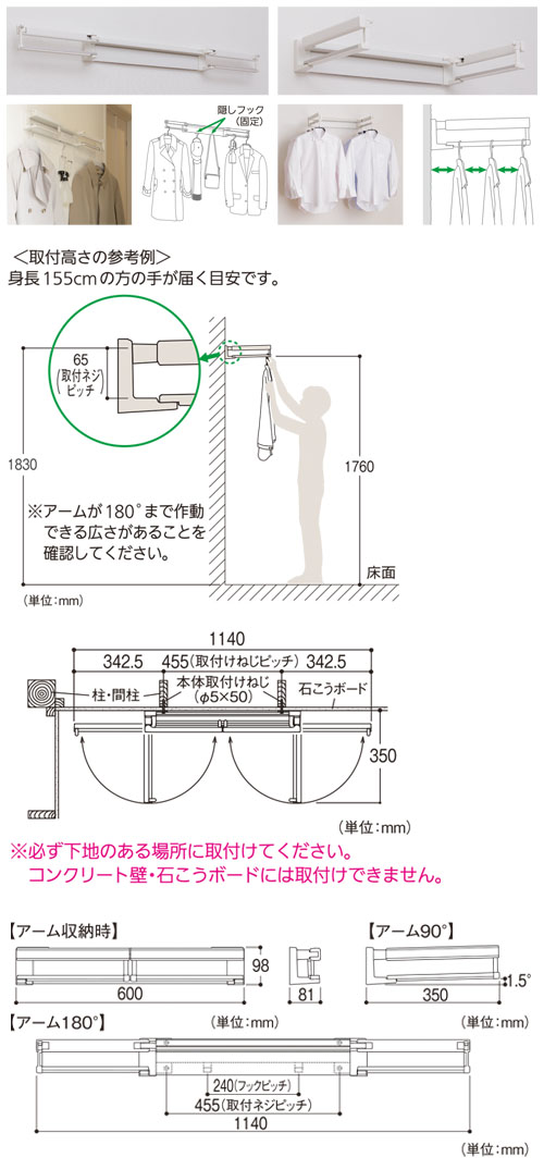 - 耐荷重:アーム1本あたり5kg、隠しフック1個あたり3kg