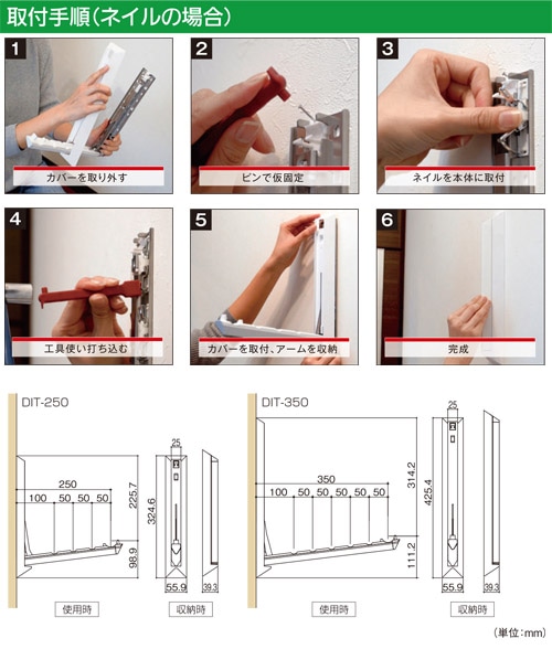 - 耐荷重(2本使用時):DIT-250/10kg、DIT-350/16kg