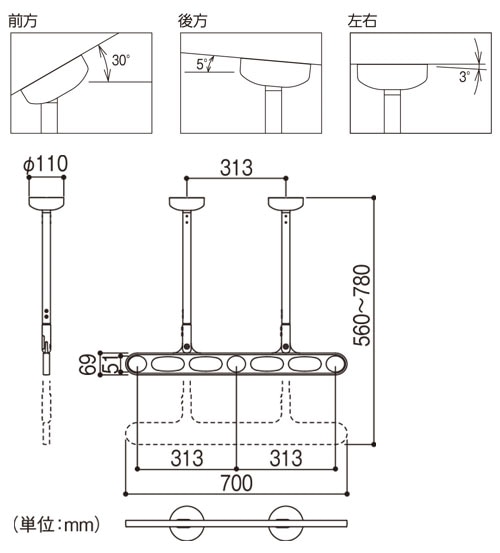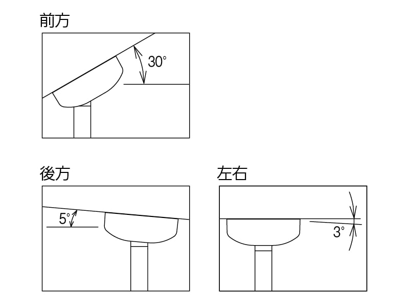 - 前方30度、後方5度、左右3度までの傾斜に対応。