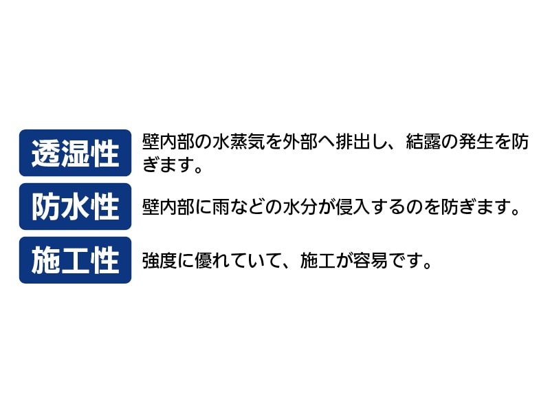 - 壁内部の水蒸気を外部へ排出し、結露の発生を防ぎます。