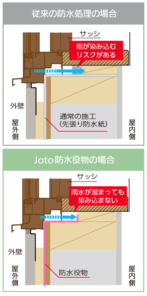 - 3面交点と水返し部を一体成形品とすることでピンホール発生の心配がなくなります。