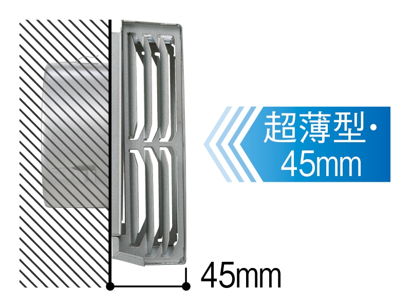 - 壁からの出っ張りが45mmと少ない、超薄型のスリムフードです。