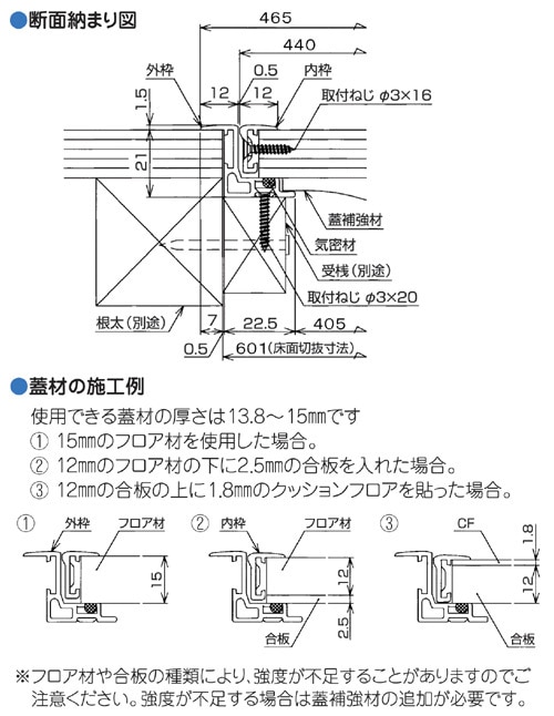 - 外枠・内蓋とも12mm額縁タイプなので、温度差によりフロア材の伸縮が生じても、枠とすき間が生じない構造。