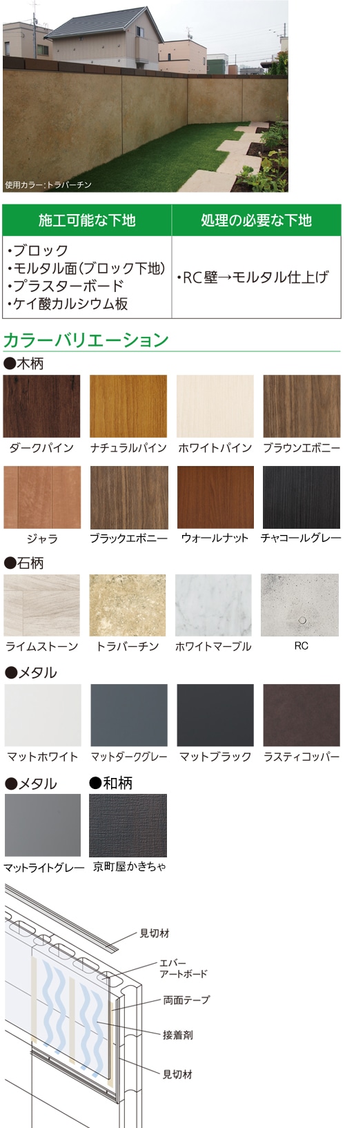 - 既存の壁やブロック塀に貼り付けて、新しい景観を作り出します。