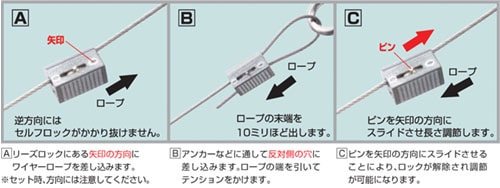 リーズロック 適合ワイヤーロープ径1.5~2.0mm 参考使用荷重(1個)1.5mm/25kg 2.0mm/45kg