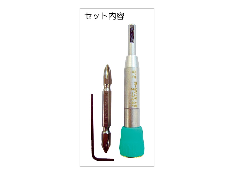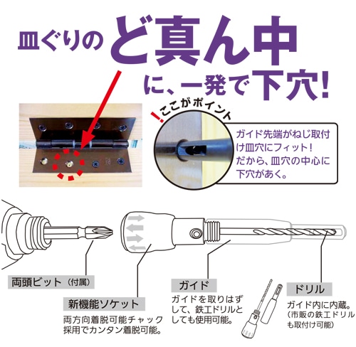 - ガイド内に内蔵のドリルは、市販の鉄工ドリルも取り付け可能です。