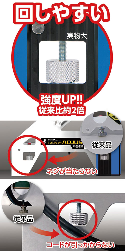 - アジャスト機能とスライド・ストップを融合させ、細かい微調整がスムーズにできます。