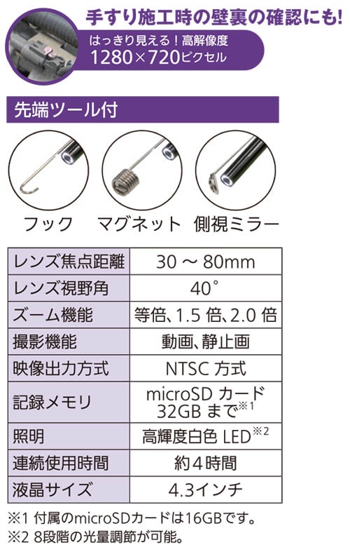 - 付属品:収納ケース、USBケーブル、microSDカード16GB、単3アルカリ乾電池4本、先端ツール