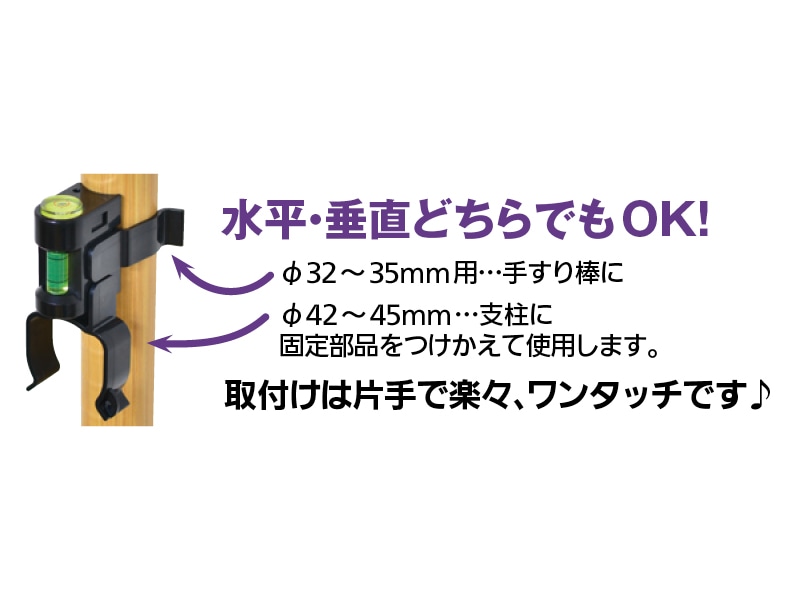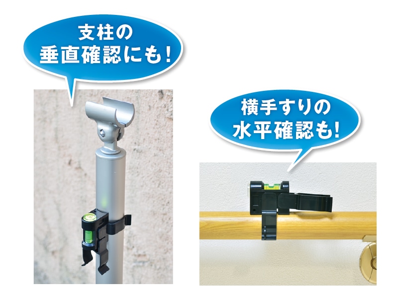 - 縦手すり、横手すり、支柱などの垂直・水平確認に。便利なクリップ式水準器です。