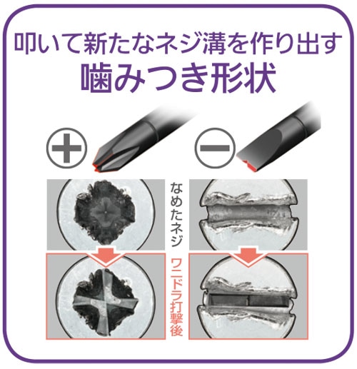 - 叩いて新たなネジ溝を作り出す噛みつき形状。