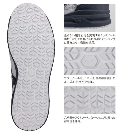 - 六角形のアウトソールパターンにより、優れた耐滑性を発揮。