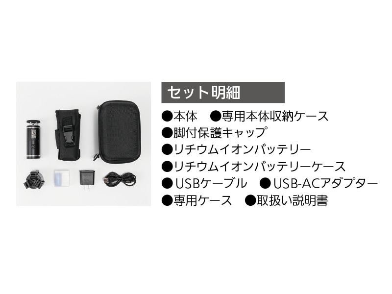 - セット明細:本体・専用本体収納ケース・脚付保護キャップ・リチウムイオンバッテリー・リチウムイオンバッテリーケース・USBケーブル・USB-ACアダプター・専用ケース・取扱い説明書