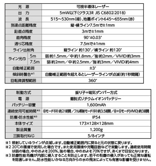 - 電源をOFFにした時の照射ラインが、次に電源をONにした時にそのまま照射されるラインメモリー機能付です。こまめに電源をOFFにしても、復帰時に照射ラインを切り替える必要がありません。※1