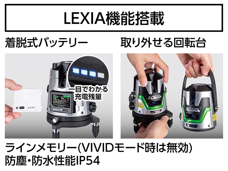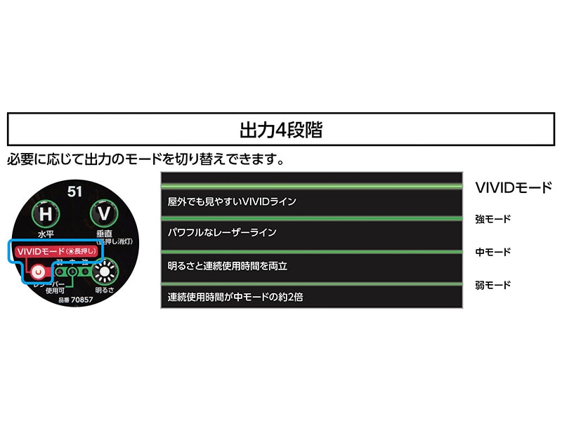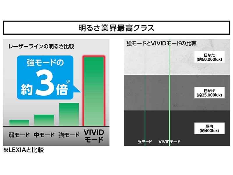 - レーザーラインの明るさは4段階で切替え可能。VIVIDモードはVIVIDモードは強モードの約3倍の明るさで照射できます。
