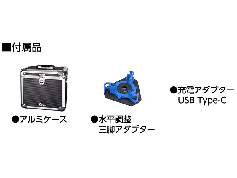 - 付属品:アルミケース、水平調整三脚アダプター、充電アダプター USB TypeC