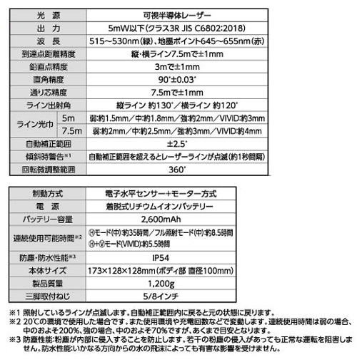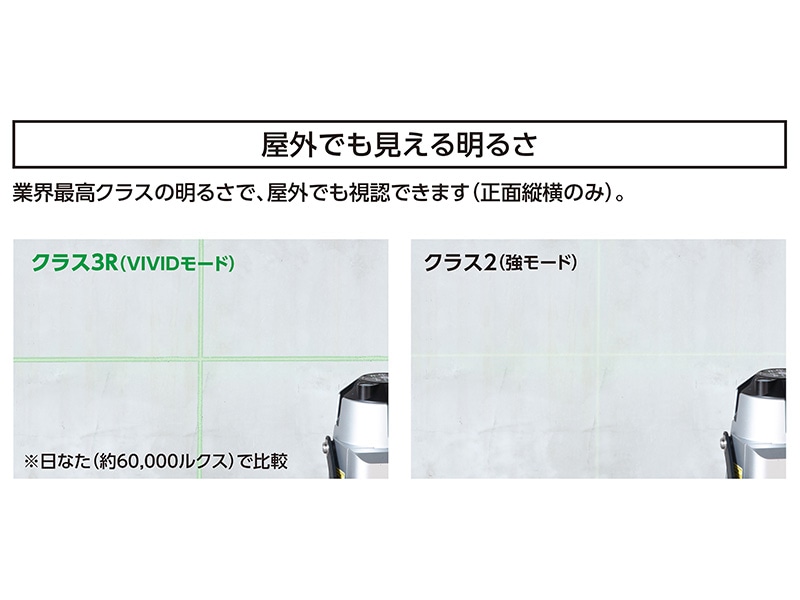 - レーザーラインの明るさを4段階で切り替えることができます。強モードは明るい現場で見やすく、従来品に比べ約2倍の明るさの高出力レーザーです。VIVIDモードは強モードの約3倍の明るさで照射できます。