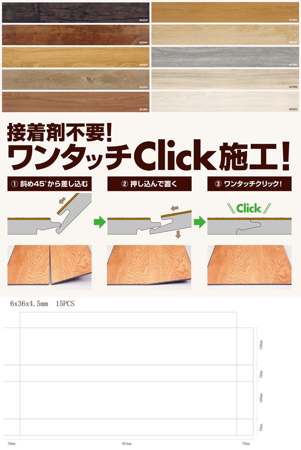 - サネがクリック式のため、斜めから差し込んで置くだけ。接着材を使わないので、部分貼り替えや原状回復も簡単です。