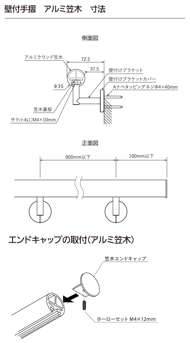 - 材質:アルミ笠木/アルミ押出成形、壁付けブラケット/亜鉛ダイカスド壁付プラケットカパー/PP笠木裏板・笠木エンドキャップ(アルミ笠木用)/スチール