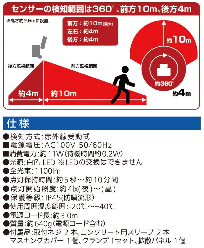 - 付属品:取付ネジ2本、コンクリート用スリーブ2本、マスキングカバー1個、クランプ1セット、拡散パネル1個