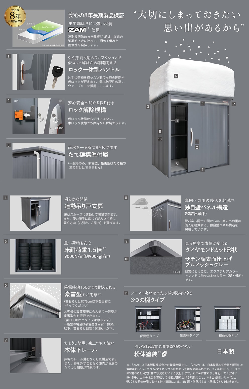 - 付属品:アンカープレート4セット、鍵2本、たて樋1本(豪雪型は取付不可)