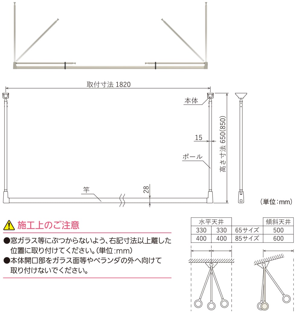 - ポールと竿が一体型の軒天用物干。竿を別途購入する必要がないだけでなく、直線を基調とした統一感のあるデザインで住宅の美観にも配慮。