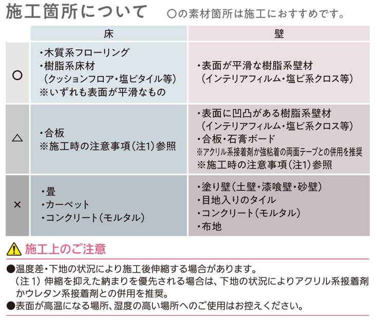 (注1)伸縮を抑えた収まりを優先される場合は、下地の状況によりアクリル系接着剤かウレタン系接着剤との併用を推奨。 - 表面が高温になる場所、湿度の高い場所へのご使用はお控えください。