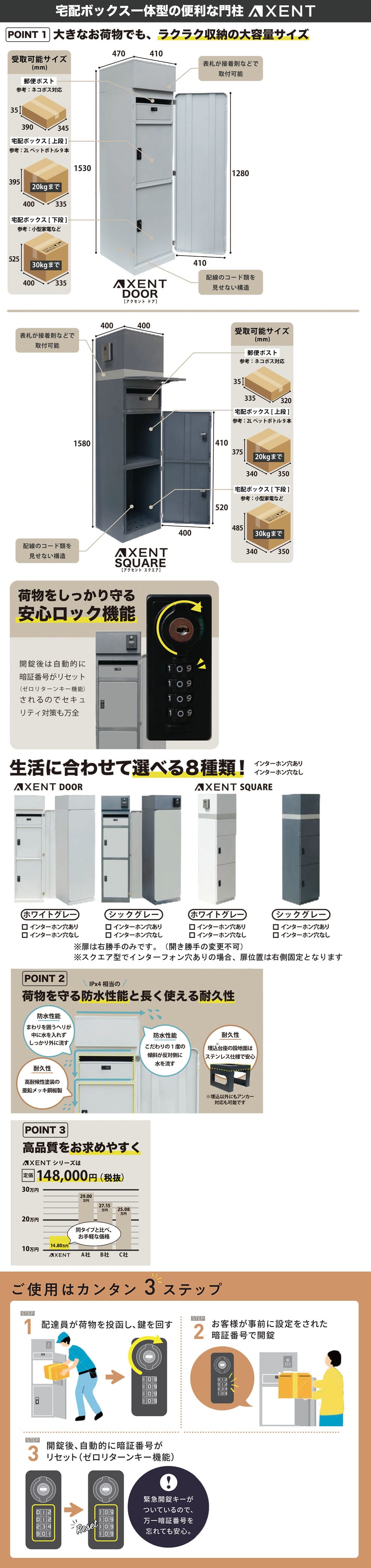 - AXENTは、宅配ボックス・ポスト・インターホンを一体化した機能門柱です。