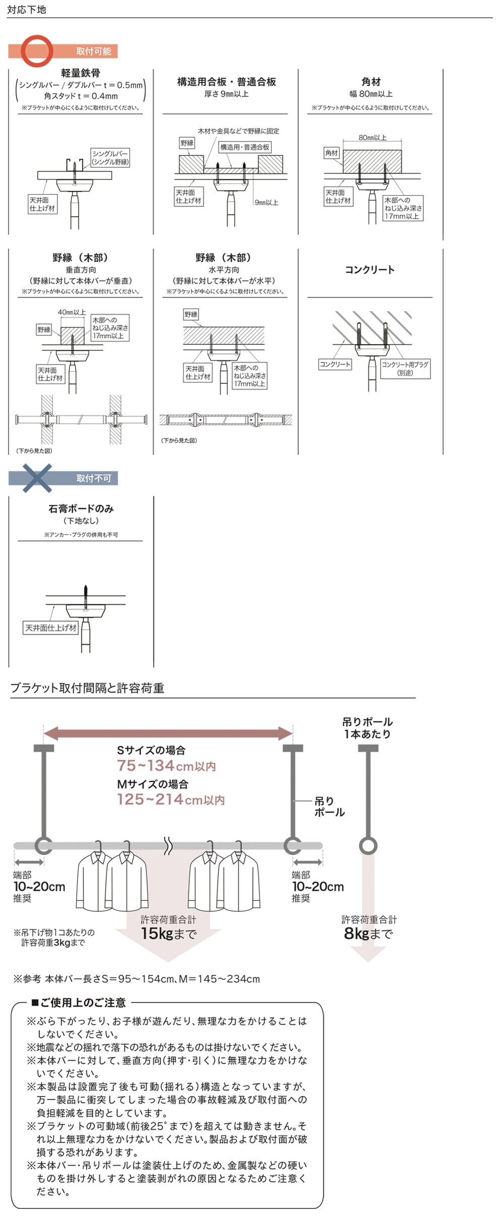 ※吊りポールの吊りポール、リング、ジョイントは分解できません。 - 取付可能下地:軽量鉄骨(シングルバー/ダブルバーt=0.5mm)、角スタッドt=0.4mm、構造用合板・普通合板(厚さ9mm以上)、水平野縁、角材(幅80mm以上)、野縁(木部)、コンクリート