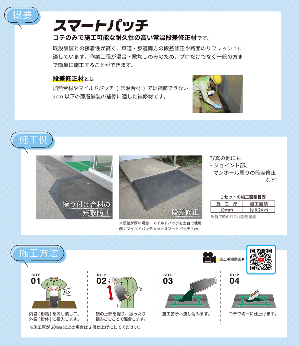 - 段差修正材とは:加熱合材やマイルドパッチ(常温合材)では補修できない2cm以下の薄層舗装に適した補修材です。
